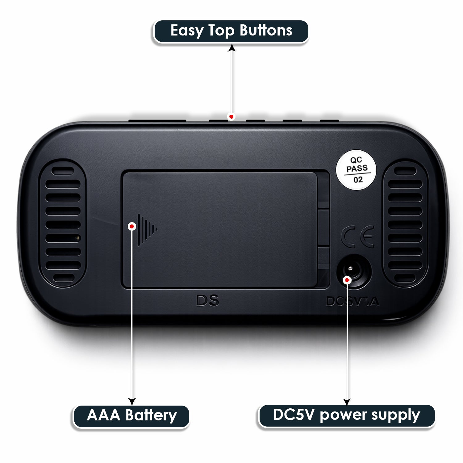Bright LED display clearly shows time with selectable 12/24 hour format. Designed for easy viewing during both day and night.